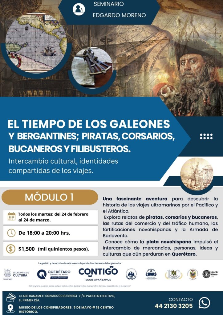 Descubre la fascinante historia de piratas, corsarios, bucaneros y filibusteros en el seminario «El Tiempo de los Galeones y Bergantines» en el Museo de los Conspiradores, Querétaro. ¡Sumérgete en la era de la navegación antigua!